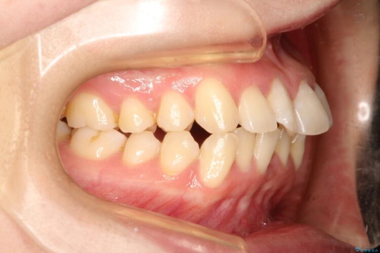 診査をしたところ下顎の側方偏位(上下の真ん中にある歯がずれている状態)が確認されましたが、外科矯正は希望されませんでしたのでそのまま矯正をしています。