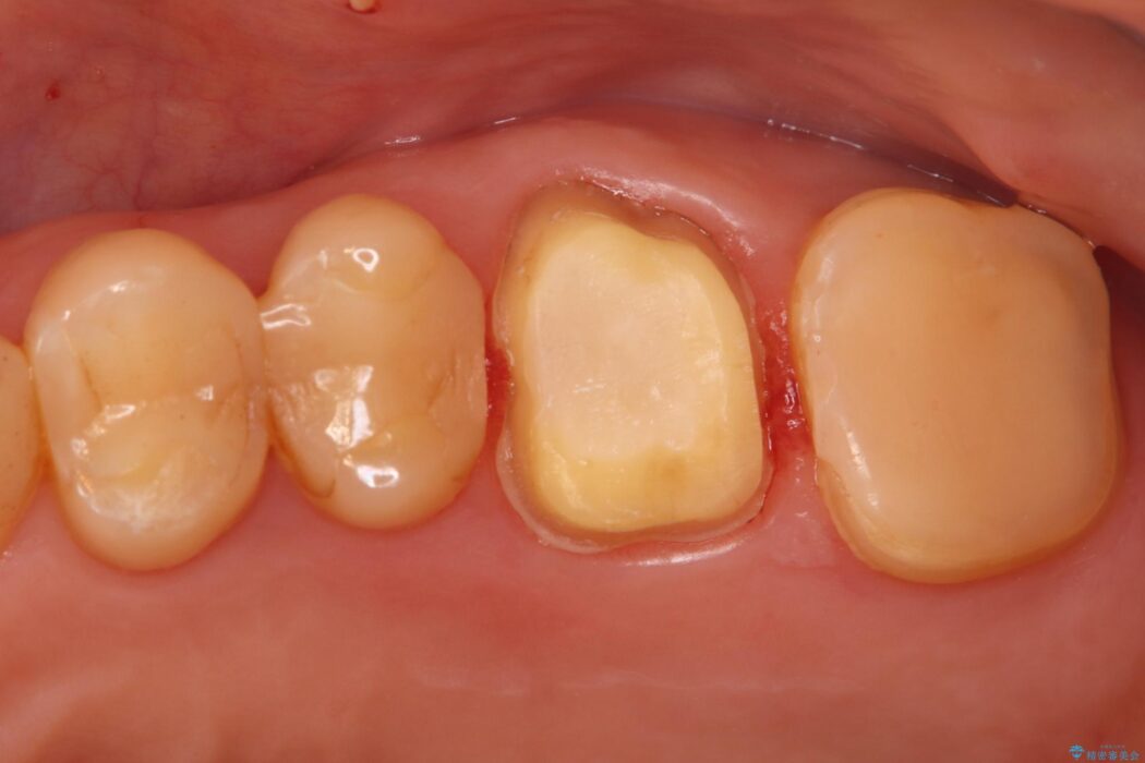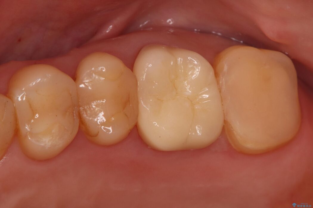 根管治療が完了し、歯の内部が清潔で安定した状態になった後、歯を保護し、強い咬合力に耐えられるようクラウンを装着しました。クラウンは、患者様の希望や咬み合わせの状態に応じて、機能性・審美性に優れた素材を選択し、精密に作製しました。