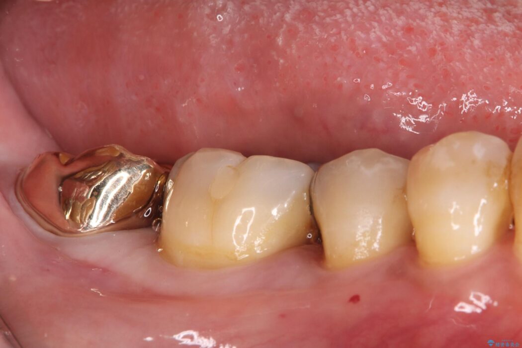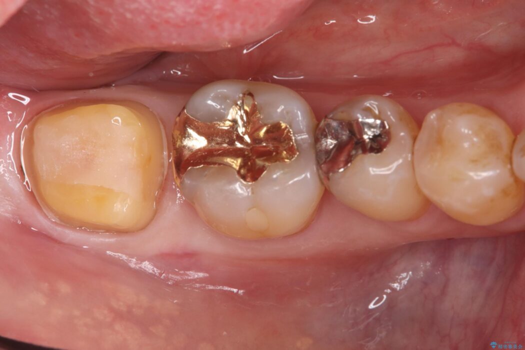 検査の結果、残存歯質が少なく破折リスクが高いため、歯全体の補強が必要と診断しました。強い咬合力に耐えられるよう、適合性と強度に優れたPGAクラウンによる修復を計画しました。これにより、二次カリエス(虫歯の再発)や破折を防ぎ、奥歯の機能を長期的に安定させます。