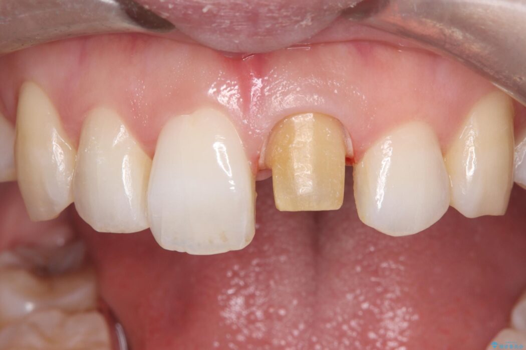 そこで、まずは土台を外して根の内部をきれいにする再根管治療を行い、基礎をやり直した上で、透明感の高いオールセラミッククラウンで被せ直す治療計画を立案。単に白くするだけでなく、再発を防ぎ、長期的に美しい状態を保つことを目指しました。