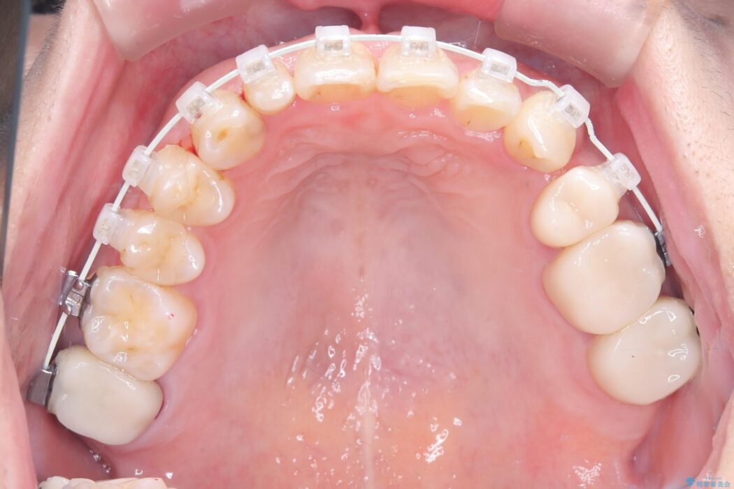 治療が進むにつれ、突出していた八重歯がスムーズに列に収まり、凹凸がなくなったことで、以前よりもブラッシングがしやすく清潔な口腔環境が整いました。治療完了後、長年のコンプレックスから解放された患者様の笑顔は非常に明るく、40代からでも遅くない「大人の矯正」の大きなメリットを実感していただける症例となりました。