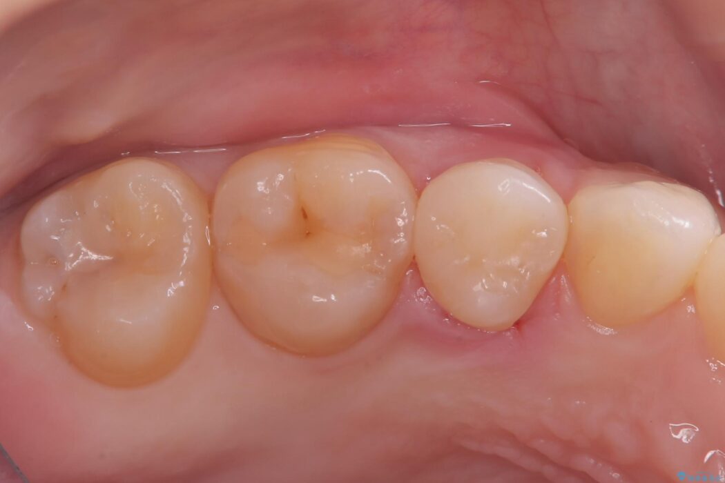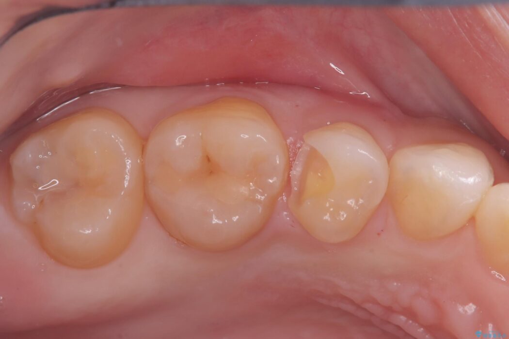視診およびレントゲン検査の結果、表面の穴は小さいものの、内部で虫歯が広がっていることが確認されました。患者様から「目立たないように治したい」というご希望があったため、健全な歯質を極力残しながら、審美性と耐久性に優れたセラミックインレーで修復する計画を立案しました。