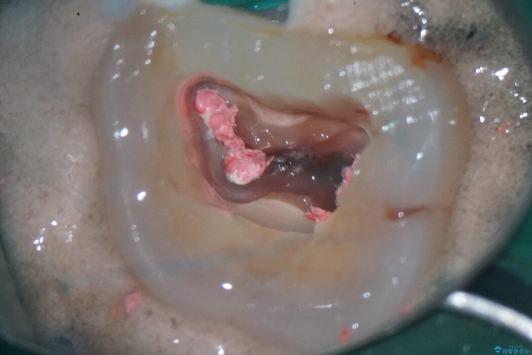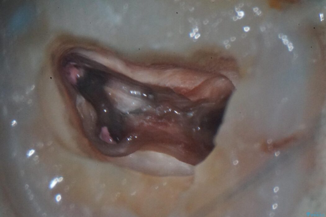 マイクロスコープを使用し、根管内を強拡大して観察したところ、従来の治療では見逃されていた根管「MB2」を発見しました。この未処置だった根管内の汚れを徹底的に除去・消毒することで、痛みの再発リスクを減らしました。