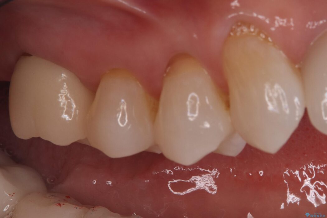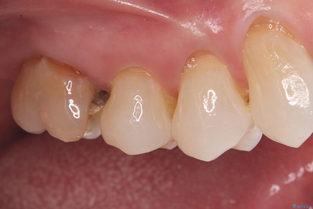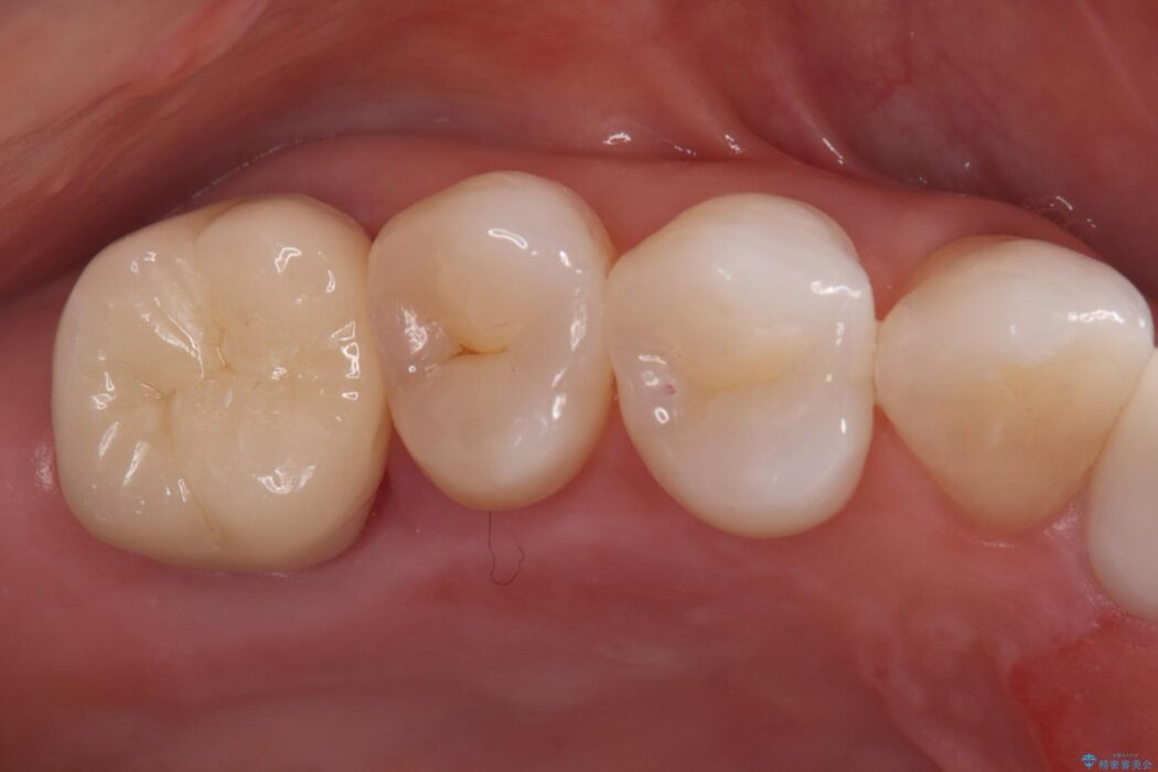 レントゲンおよび視診の結果、詰め物が外れた内部で虫歯が再発しており、根の先にも炎症が見られたため、再根管治療(根の再治療)が必要と診断しました。 特に上顎の大きな奥歯(第一大臼歯)は、通常の根管以外に「MB2」と呼ばれる隠れた根管が存在することが多く、これが未処置のままだと再発の原因となります。そこで、歯科用顕微鏡(マイクロスコープ)を用いて徹底的に内部を清掃し、その後、強度と審美性に優れたオールセラミッククラウンで修復する計画を立案しました。