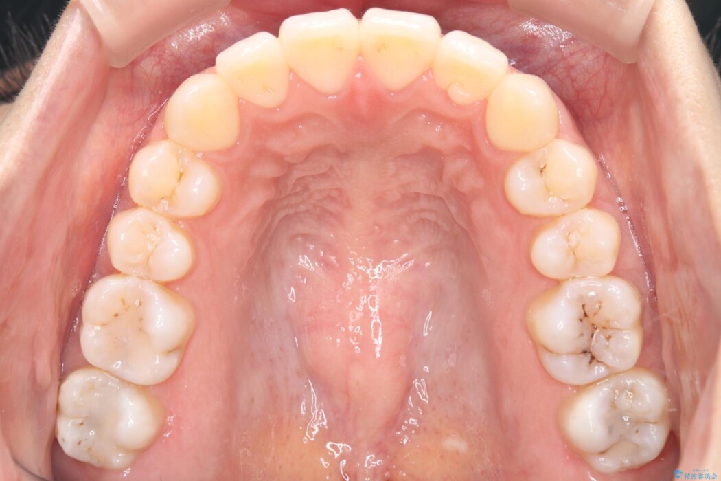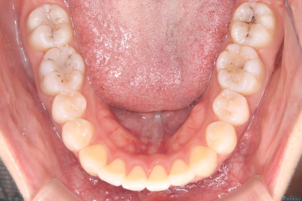 患者様には、非抜歯で矯正治療をした場合と、上下左右4番を抜歯して矯正治療を行った場合でのシミュレーションを見ていただいたうえで、非抜歯でワイヤーにて治療を行うこととしました。