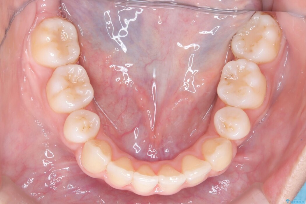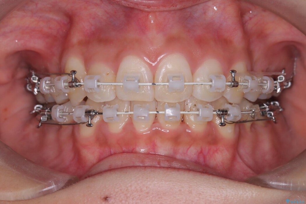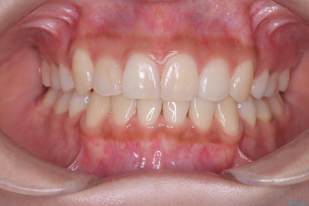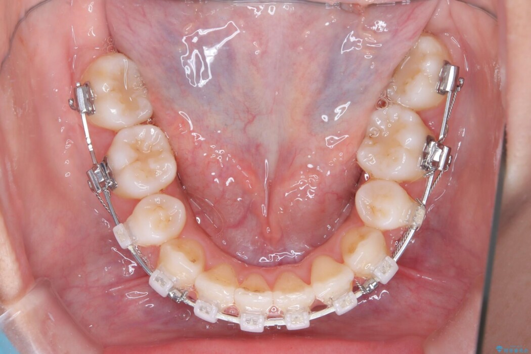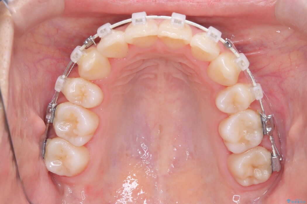 複雑に重なり合っていた前歯を、抜歯で作ったスペースを活用して丁寧に整列。単に並べるだけでなく、角度を1ミリ単位で調整しながら後ろへ下げることで、口元の突出感をスッキリ解消しました。