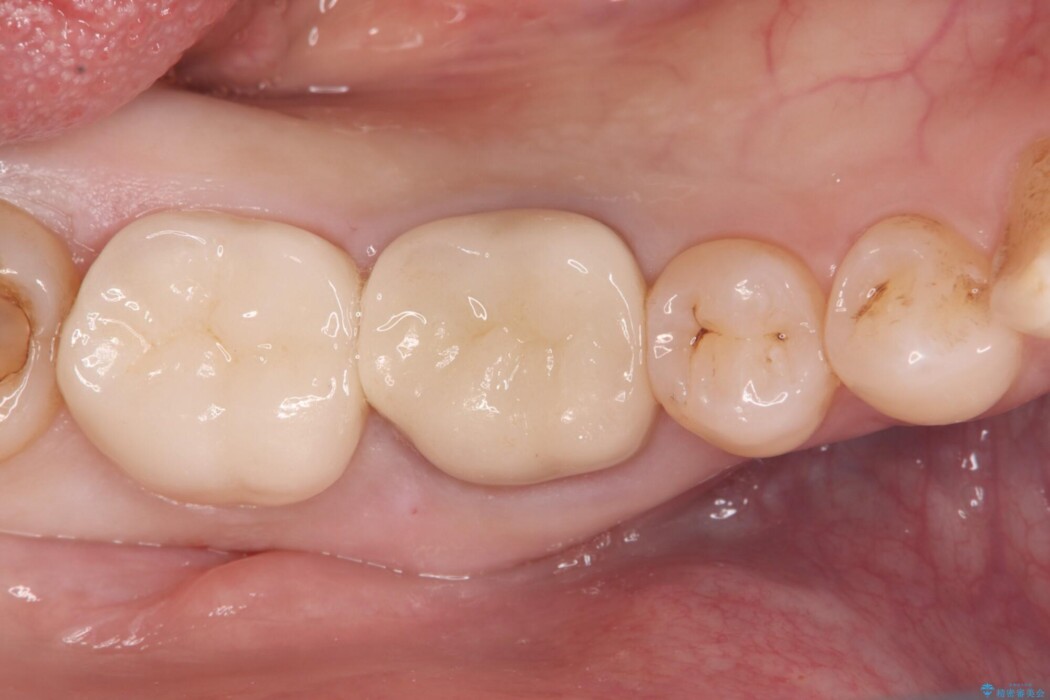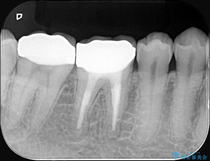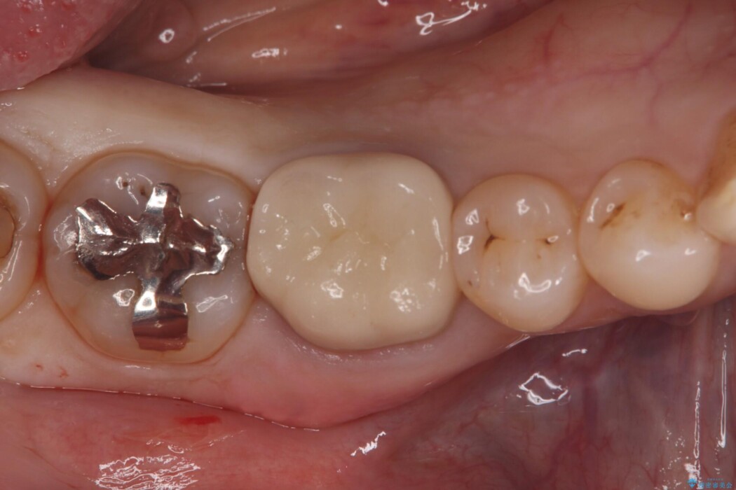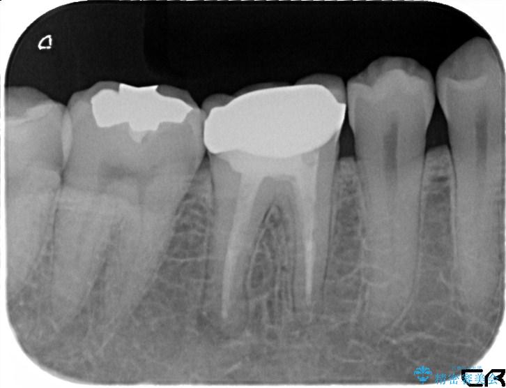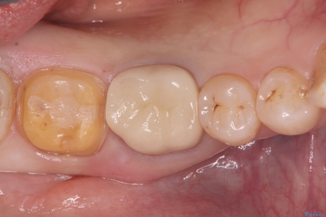 診査の結果、古い銀歯の隙間から新しい虫歯が広がっていました。ここは噛む力が強くかかる場所のため、このまま詰め物で治すと、部分的な詰め物では残存している自分の歯に負担が集中し、将来的に歯が割れてしまう「歯冠破折」のリスクが高い状態でした。