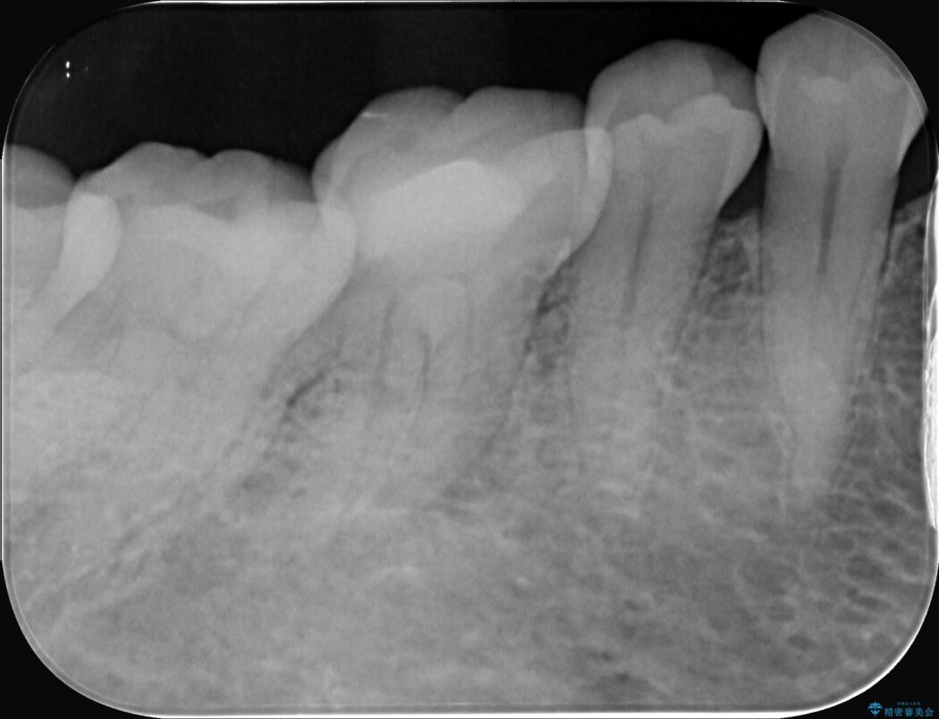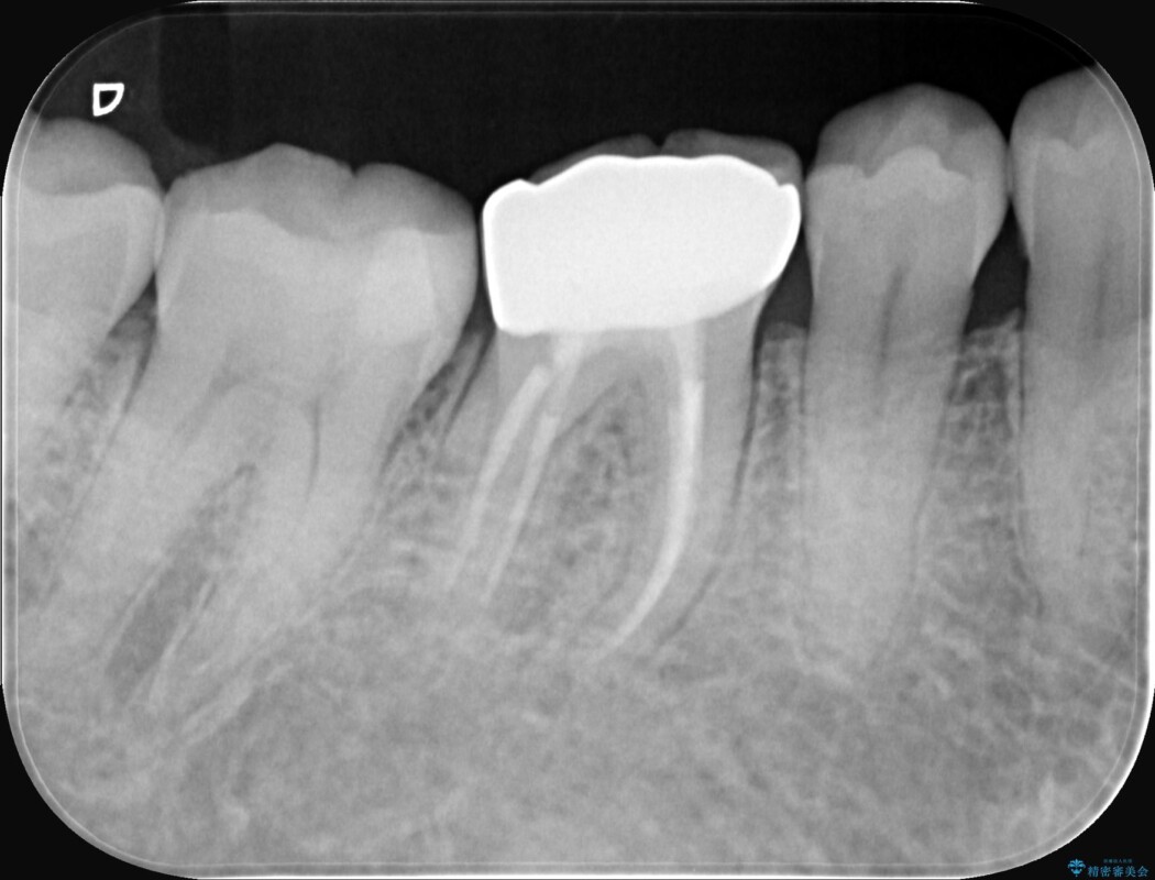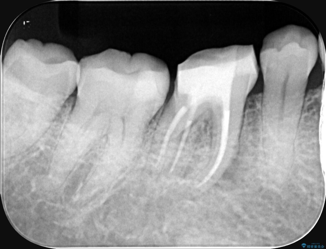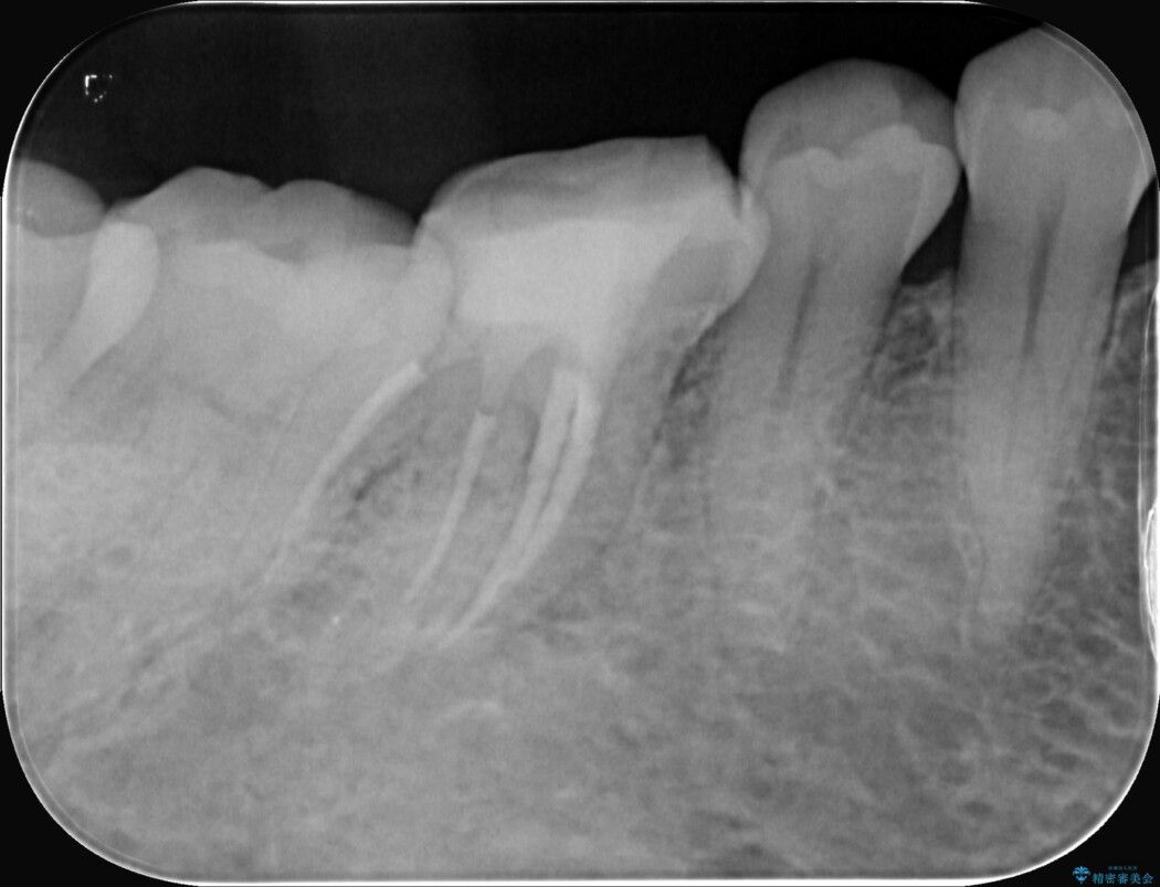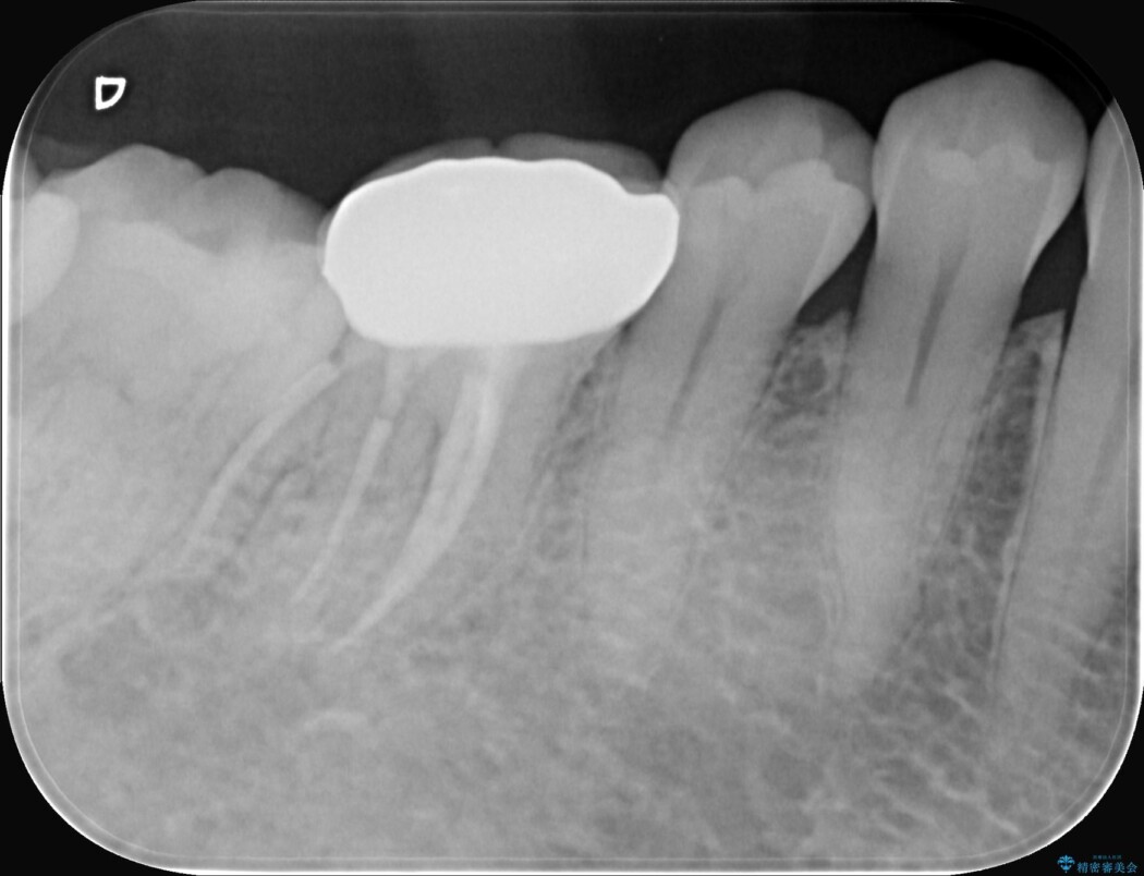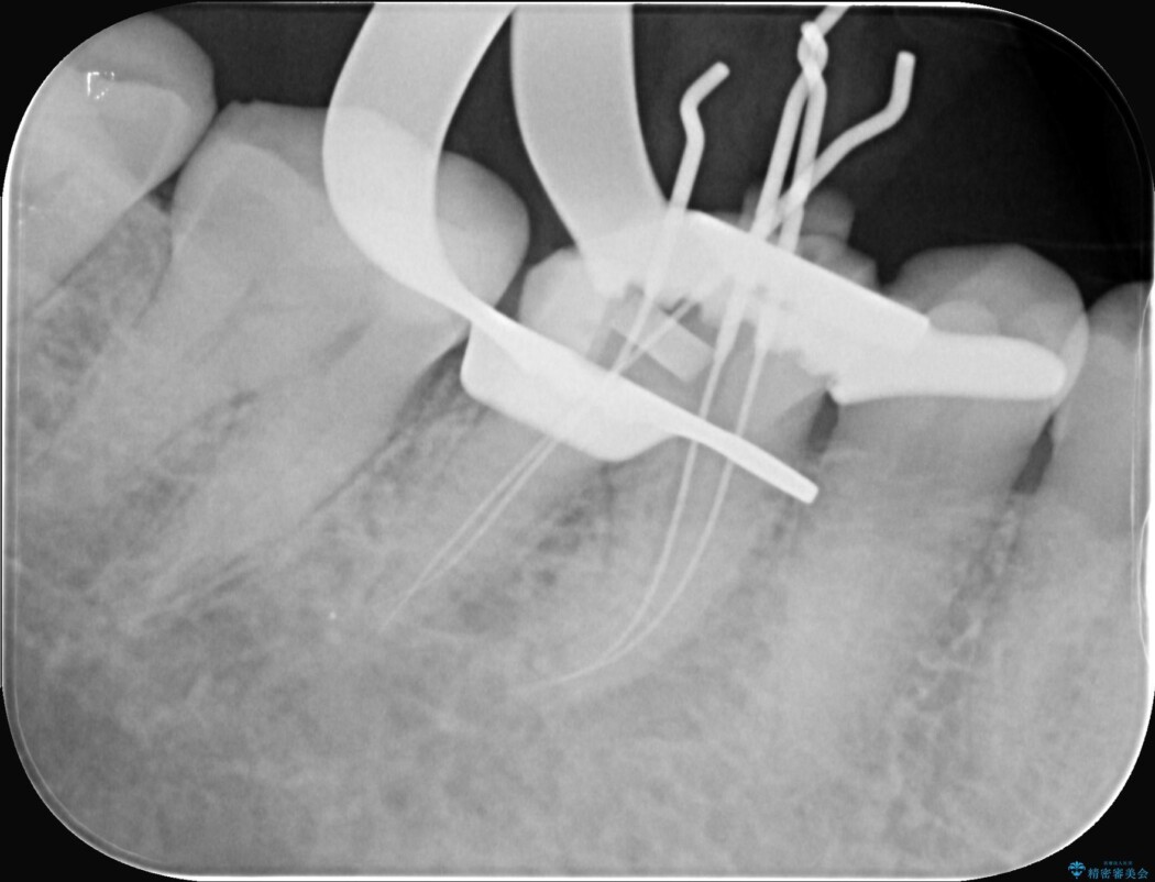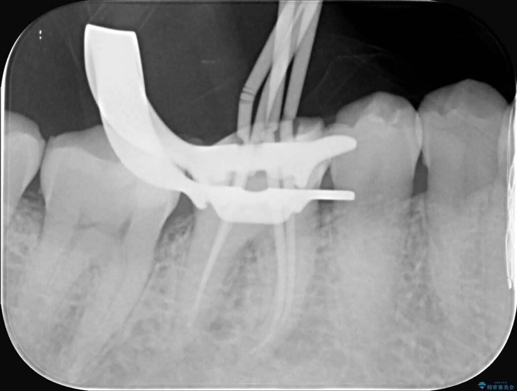 通常の治療器具では奥まで届かず、そのままでは再発や抜歯になるリスクが高いため、マイクロスコープを使用して根の奥まで精密に清掃・殺菌し、歯を残すための治療計画を立てました。