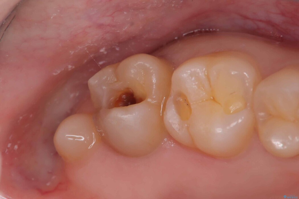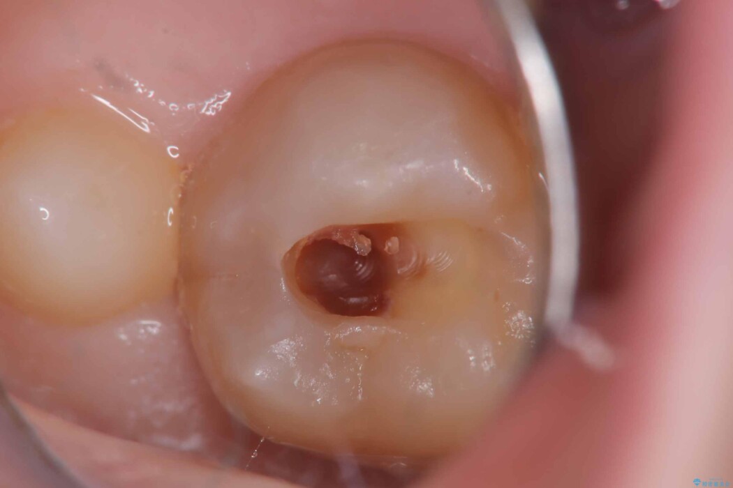 以前に詰めた白い詰め物の内部で、虫歯の再発が確認されました。